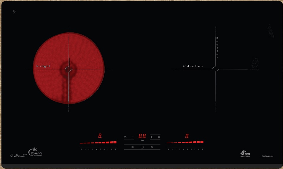 Bếp gồm 1 vùng nấu từ 220mm, và vùng nấu điện hi-light 220mm