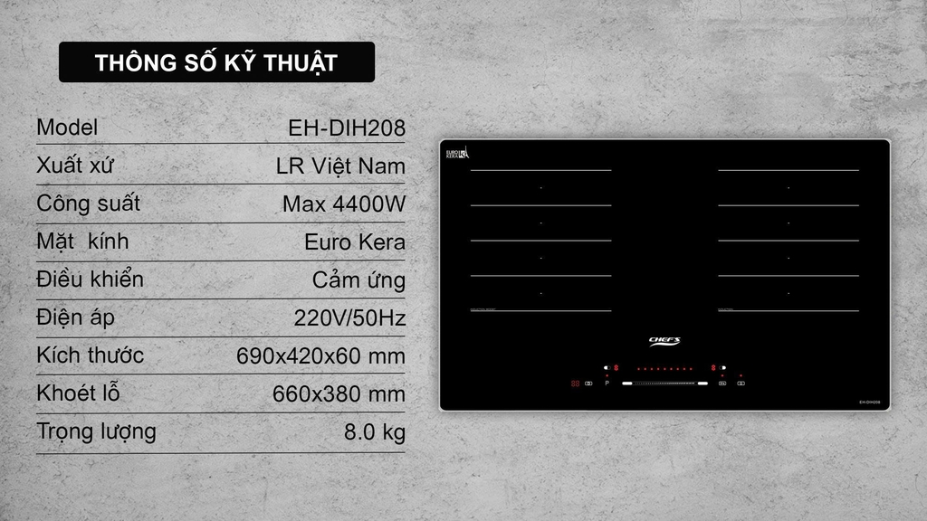 Bếp từ đôi Chef's EH-DIH208 là dòng bếp lắp ráp tại Việt Nam theo tiêu chuẩn công nghệ Châu Âu. Ra mắt năm 2021, EH-DIH208 được khách hàng đánh giá cao về thiết kế lẫn tính năng sử dụng.