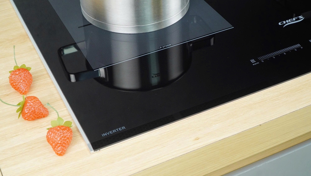 Bếp Chef’s EH-DIH896 sử dụng mặt kính Schott Ceran chống trầy xước, hạn chế bám bẩn, dễ dàng vệ sinh, lau chùi. Mặt kính vát 2 cạnh trước sau, bo viền nhôm 2 cạnh bên.