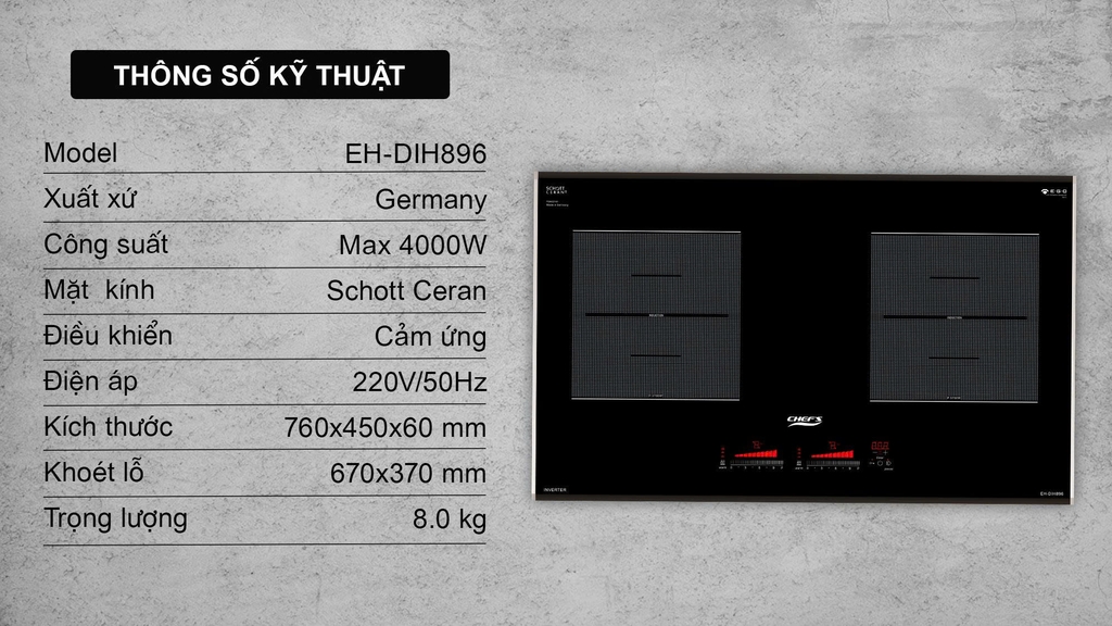 Bếp từ Chef's EH-DIH896 là một trong những model mới ra mắt của thương hiệu Chef's, thuộc dòng bếp cao cấp có xuất xứ từ Đức. Bếp có thiết kế sang trọng, hiện đại theo phong cách Châu Âu, ứng dụng công nghệ Inverter thông minh giúp tiết kiệm điện năng tối đa.
