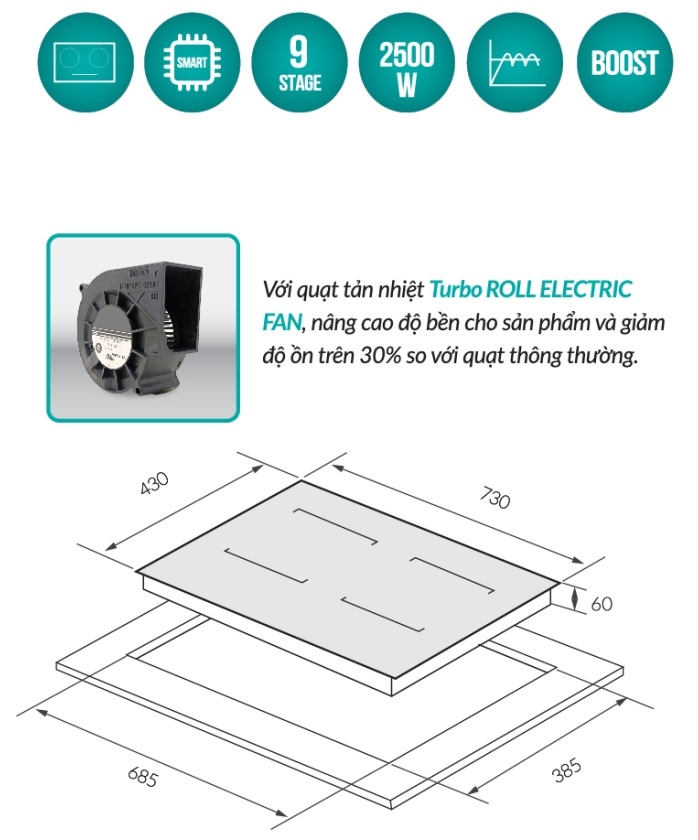 Hệ thống quạt tản nhiệt Turbo siêu êm (≤38dB), giúp bếp luôn hoạt động trong trạng thái tối ưu.