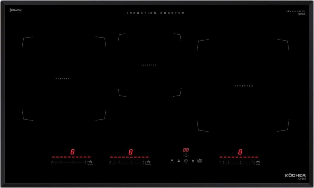 Bếp từ Kocher DI-355 với thiết kế mặt kính đen bóng sang trọng, 3 vùng nấu rộng rãi và bảng điều khiển cảm ứng Slider hiện đại.