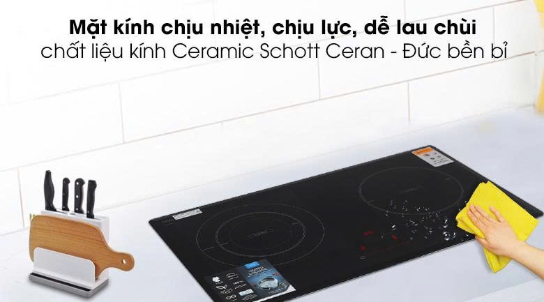 Bếp từ Kocher DI 801GE IPLUS sử dụng mặt kính Schott ceran được làm từ chất liệu gốm thủy tinh có khả năng chịu lực va đập và sốc nhiệt tới 800 độ C, chống xước tốt nên tuổi thọ rất cao. Mặt bếp tản nhiệt nhanh và được cách điện an toàn với các linh kiện điện tử bên trong thân. Bạn có thể yên tâm sử dụng mà không lo bị bỏng hay điện giật.