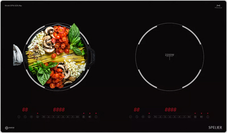 BẾP TỪ SPM – 928I PLUS được tích hợp chức năng tự nhận diện vùng nấu, khi ta đặt nồi lên 1 trong 2 vùng nấu sau đó ấn nút khởi động bếp sau thời gian 1-2 giây bếp sẽ tự động tìm vùng nấu đã có nồi, ta chỉ việc điều chỉnh mức công suất to nhỏ theo ý muốn mà không phải thao tác chọn vùng nấu như bếp thông thường. Công nghệ Dual core Inverter được áp dụng trên bếp từ Spelier có khả năng phản ứng thay đổi công suất theo điều khiển ngay tức thì, khi người dùng điều chỉnh tăng giảm nhiệt độ đun nấu, bếp điều chỉnh thay đổi tức thì về mức nhiệt độ mong muốn.
