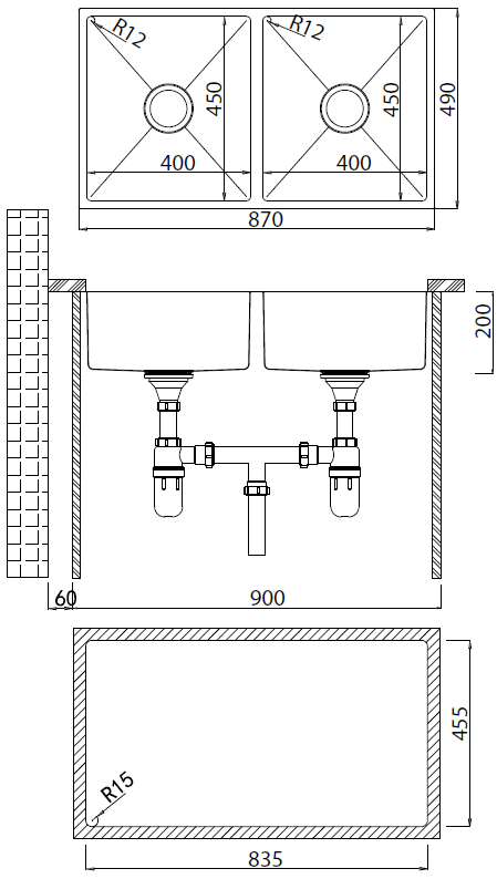 + Kích thước chậu: 870R x 490S mm