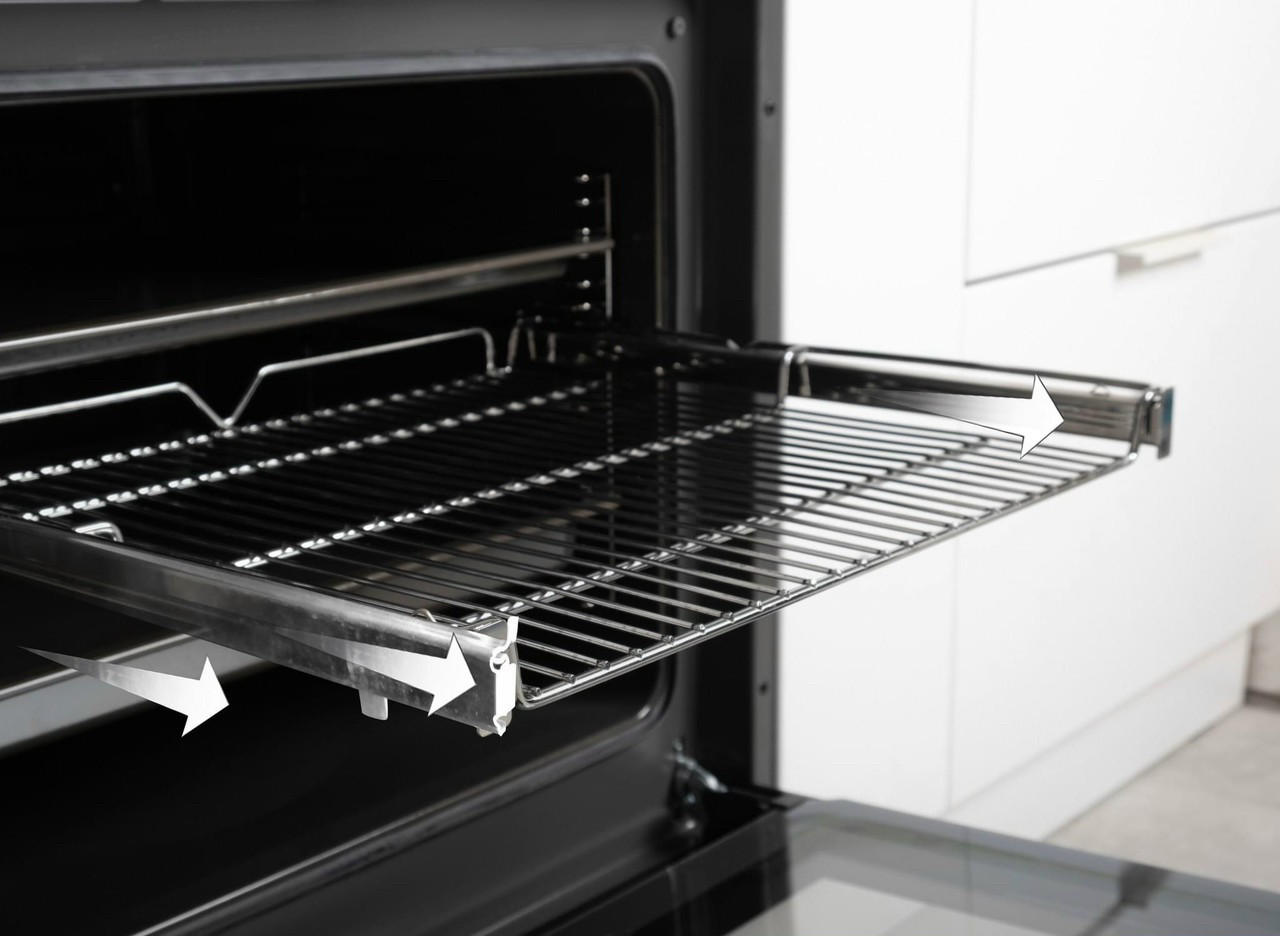 Hệ thống kệ của lò nướng an toàn và dễ sử dụng. Khi các thanh ray trượt được mở rộng hoàn toàn, một cơ chế đặc biệt sẽ cố định các thanh này ở cả hai bên để giá được giữ thẳng và hoàn toàn ổn định. Điều này làm cho việc nướng trở nên dễ dàng hơn.