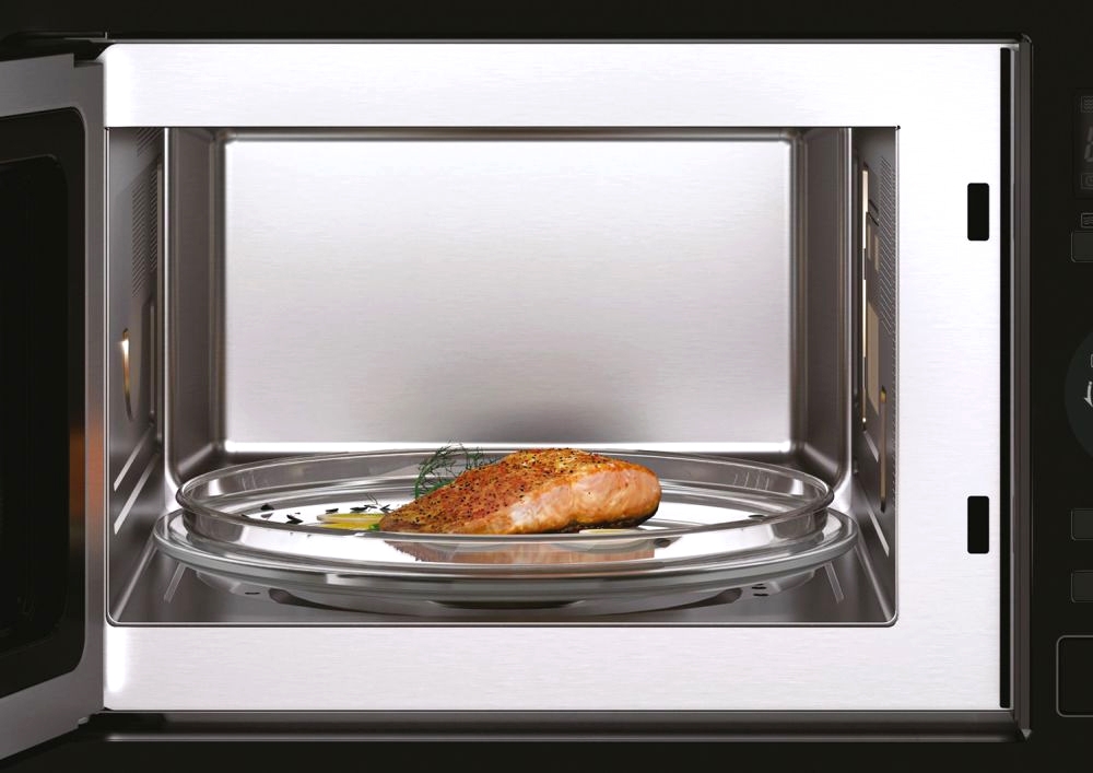 Phần thân lò làm từ chất liệu thép không gỉ, chắc chắn, không bám dấu vân tay. Cửa lò bằng kính cường lực cao cấp màu đen có khả năng chịu lực, chịu nhiệt, giữ ổn định nhiệt độ trong khoang, độ bền cao. Khoang lò sử dụng vật liệu Inox 304 – 18/10 đảm bảo an toàn thực phẩm và dễ dàng vệ sinh. Đĩa xoay thủy tinh chịu nhiệt, đường kính 245mm làm cho thức ăn chín đều.
