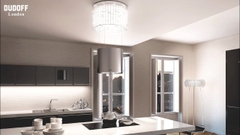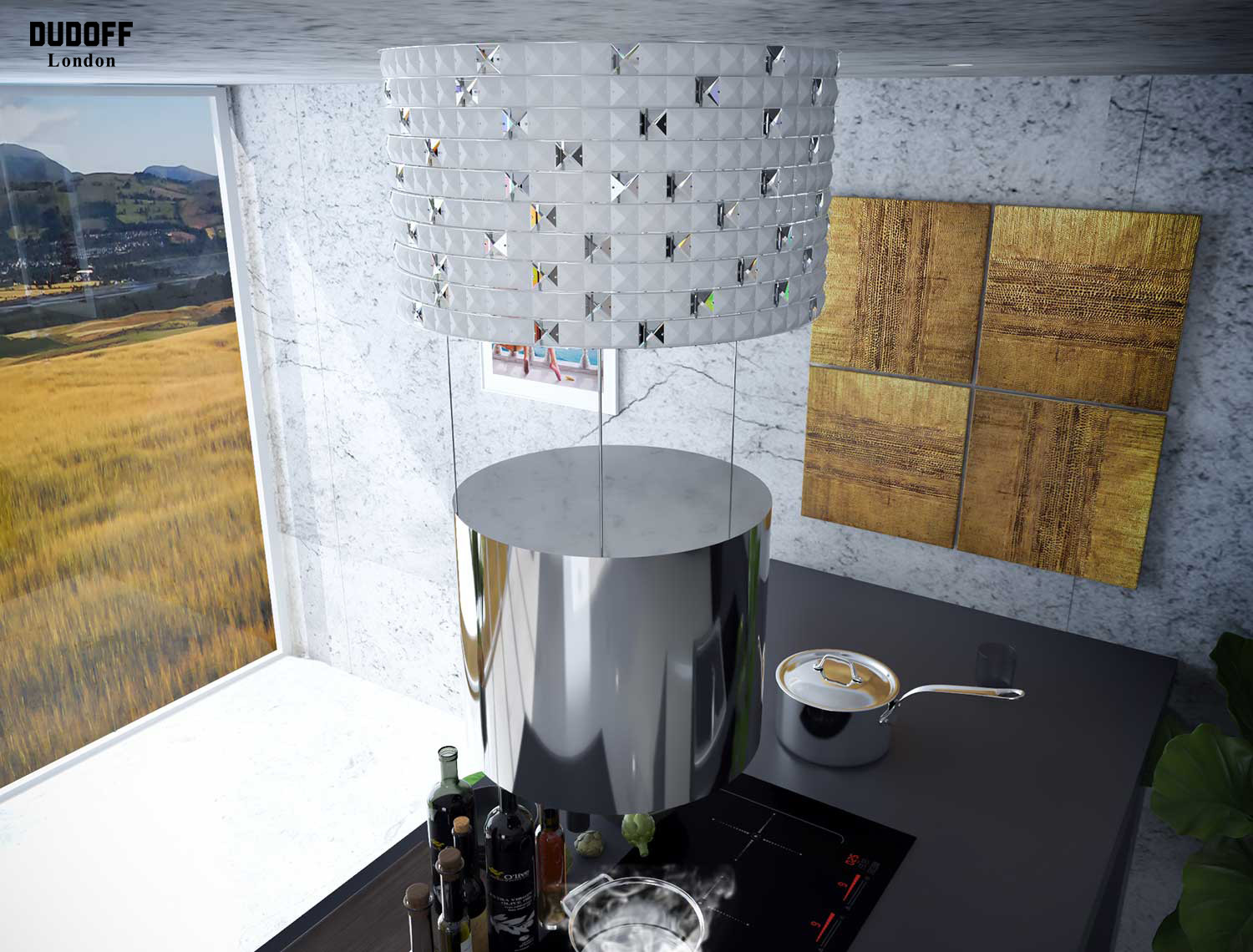 Máy hút mùi trang trí Amara được thiết kế thủ công đầy sáng tạo với thân máy hình trụ tròn bằng Inox không gỉ kết nối với khối đèn gắn pha lê của Áo bên trên bằng hệ thống dây cáp Inox chắc chắn, đặc biệt có thể tùy chỉnh độ cao theo ý muốn. Amara là sản phẩm máy hút mùi sáng tạo của kĩ thuật công nghệ và nghệ thuật ánh sáng. Mặt đáy của máy được trang bị hệ thống 4 cụm đèn Led hội tụ giúp không gian sáng hơn khi nấu nướng.