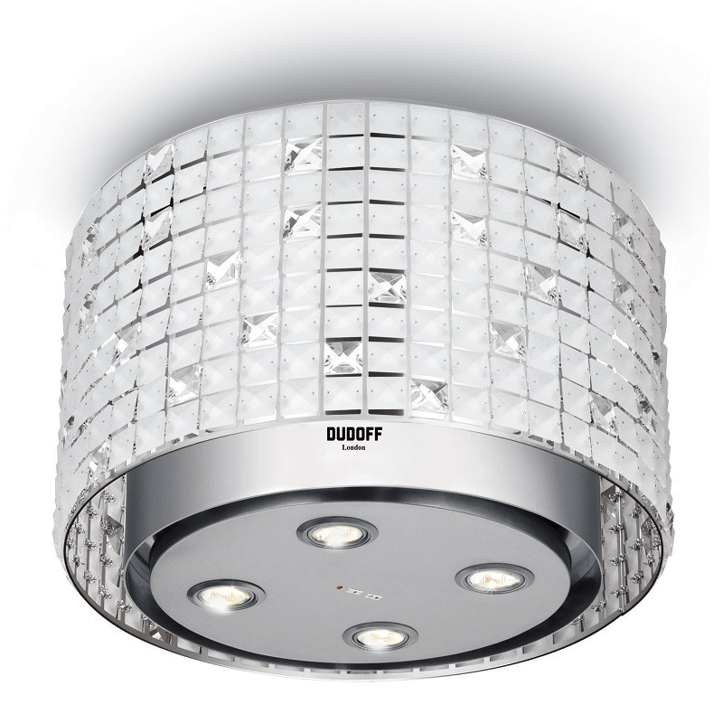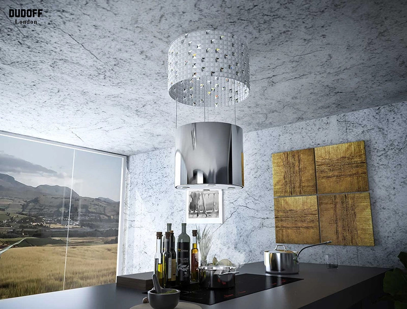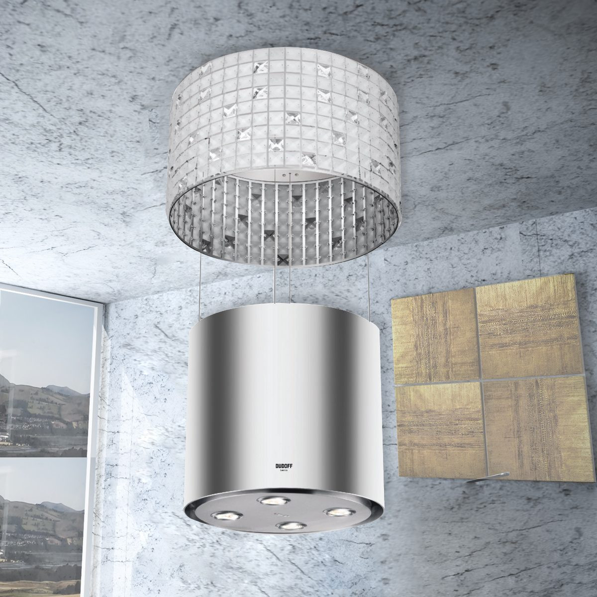 Máy hút mùi đảo trang trí treo cáp, hình trụ tròn, chế tạo bán thủ công kết hợp giữa Inox 304 và pha lê trang trí.