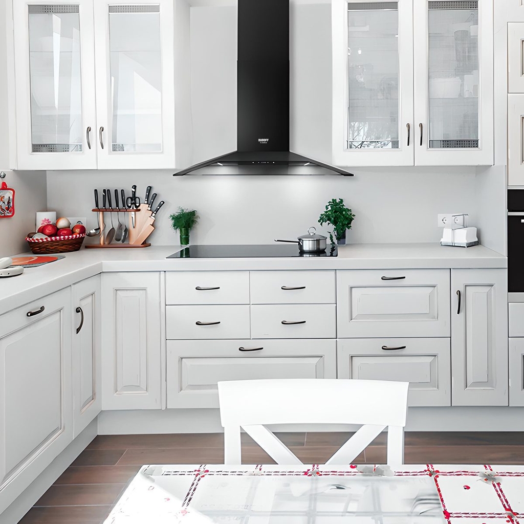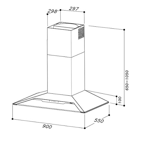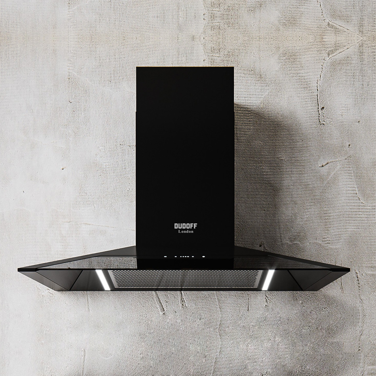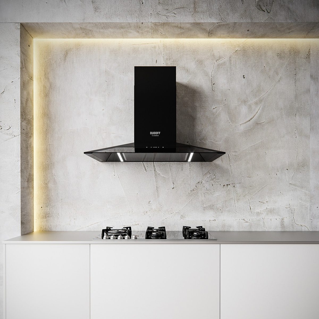 Máy hút mùi treo tường Jupiter B dạng hình nón, với thân máy màu đen kết hợp toa hút kính màu khói khơi nguồn cảm hứng cho những gia đình yêu thích phong cách cổ điển.