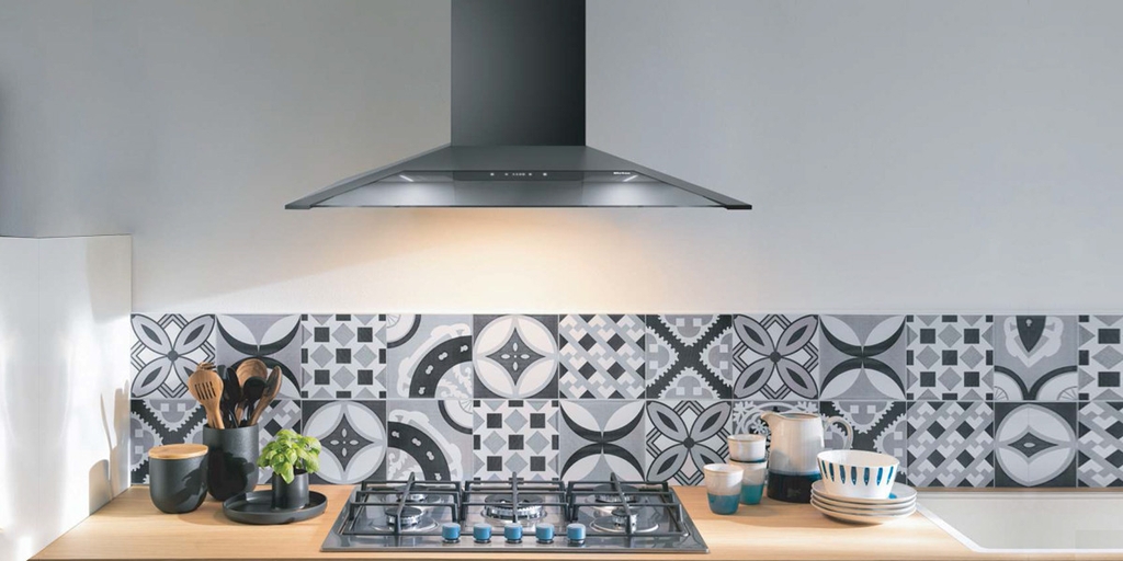 Máy hút mùi áp tường trang trí hình nón. Kết hợp kính và sơn.