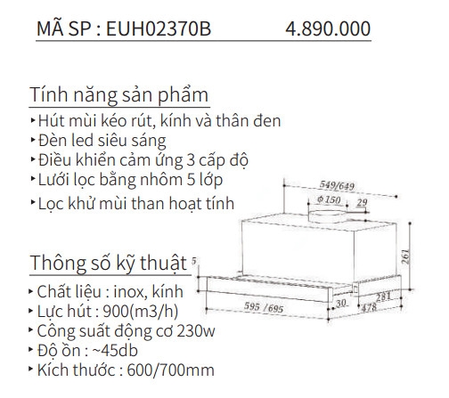 Thuộc dòng sản phẩm hút khử mùi âm tủ, rất phù hợp với những không gian bếp của gia đình Việt Nam, máy hút mùi EUH02370B của thương hiệu Eurogold là một gợi ý hoàn hảo cho bạn và gia đình. Với thiết kế đơn giản, đẹp mắt kết hợp với công suất hoạt động mạnh mẽ, thiết bị hút mùi EUH02370B sẽ cải thiện không gian nấu nướng của gia đình bạn được trong lành, sạch sẽ và thông thoáng cũng như đảm bảo an toàn cho sức khỏe của các thành viên trong gia đình.