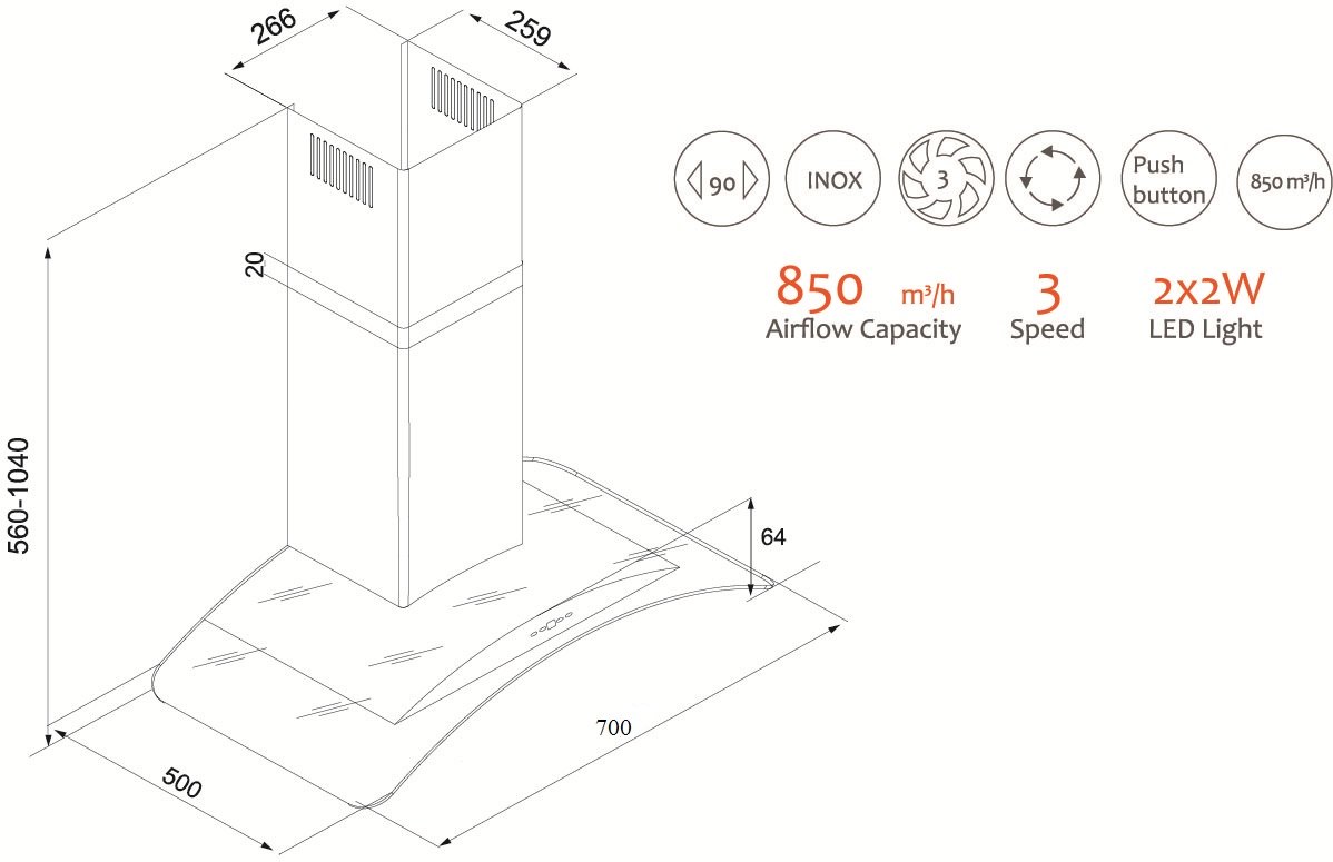 Máy hút mùi TOM 3159B-70cm là dòng máy hút mùi kính cong với thiết kế sang trọng, màu đen, kiểu dáng hiện đại. Thân máy được làm bằng chất liệu inox có độ sáng bóng cao, không bị han gỉ theo thời gian, lau sạch bụi bẩn, dầu mỡ dễ dàng bằng chất tẩy rửa chuyên dụng.