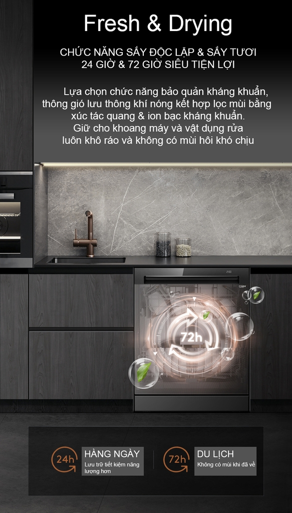 - Chức năng Fresh & Drying | Chức năng sấy tươi bằng khí nóng, sau quy trình rửa chức năng sẽ được khởi động và thổi luồng khí tươi nóng giúp cho các vật dụng trong máy rửa bát được diệt khuẩn và nấm mốc 99.99% trong 24 giờ, 72 giờ giúp bát đĩa luôn luôn nóng và vô trùng như vừa mới rửa xong.