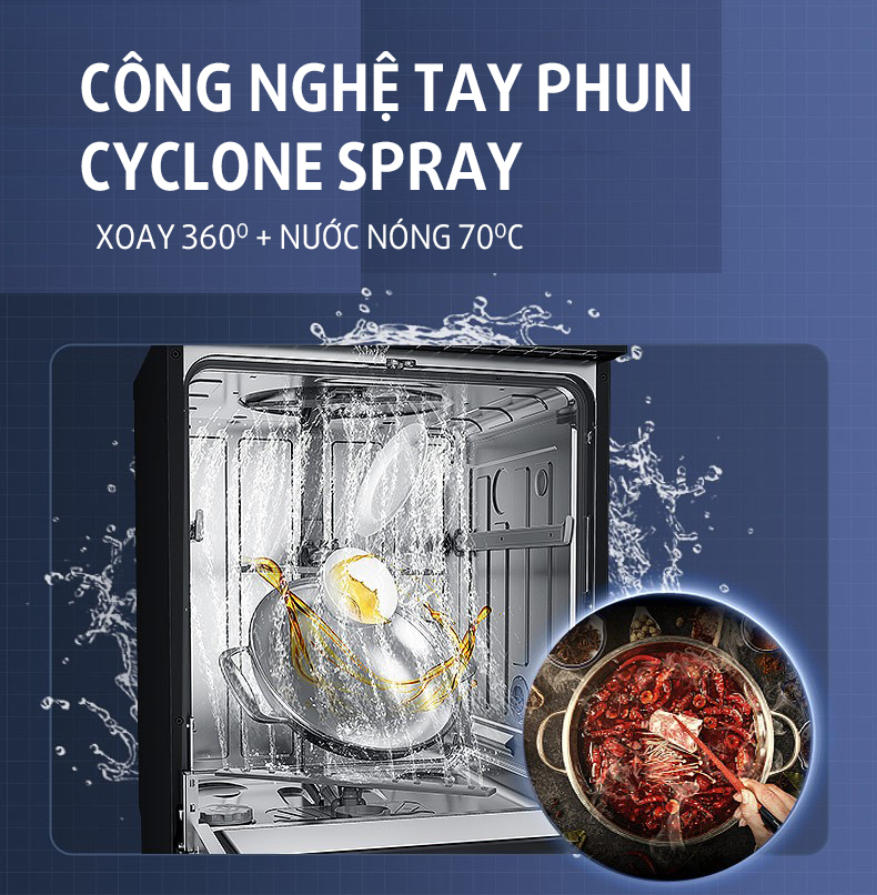 Tay phun xoay Cyclone Spray là công nghệ rửa được áp dụng phổ biến trên các dòng máy rửa bát châu âu hiện đại, áp lực nước được phun trực tiếp vào bề mặt của các vật dụng rửa. Hơn nữa nhiệt độ nước được làm nóng đến 70 độ C sẽ tăng cường khả năng làm sạch và tiệt trùng.