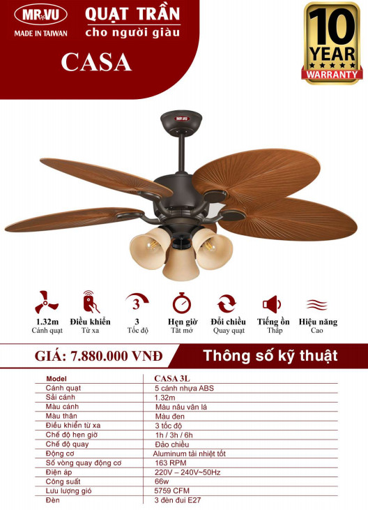 THÔNG TIN SẢN PHẨM QUẠT TRẦN CHO NGƯỜI GIÀU MR.VŨ CASA 3L