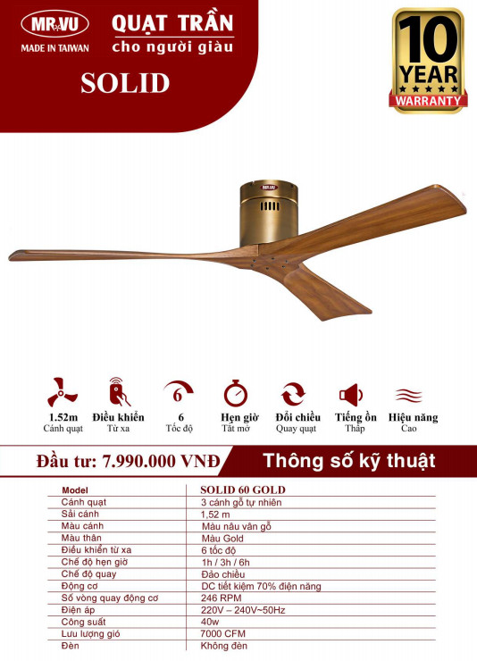 THÔNG TIN SẢN PHẨM QUẠT TRẦN CHO NGƯỜI GIÀU MR.VŨ SOLID 60 GOLD