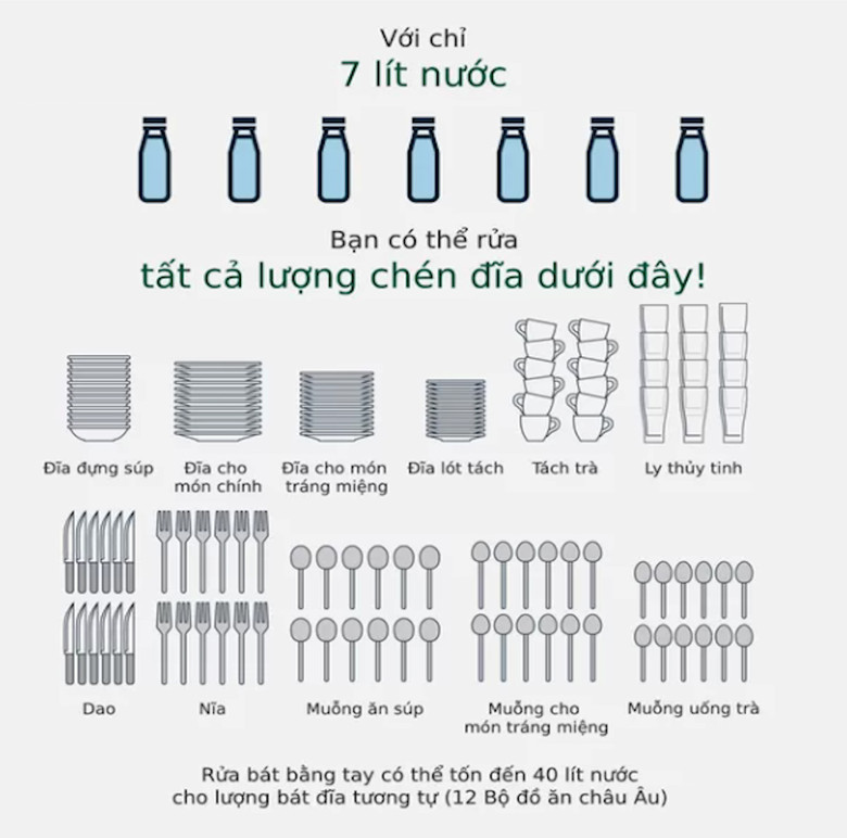 Máy rửa chén giúp bạn tiết kiệm nước, khi rửa chén bằng tay thì lượng nước sẽ hao tốn nhiều hơn vì chúng ta theo thói quen hằng ngày hay để xả liên tục và có thể mỗi lần rửa lên đến 20 lít nước, chính vì vậy hiện nay dòng máy rửa chén được hiện đại hóa và ưu việt hơn, chỉ sử dụng tối đa 9,5 lít cho một lần rửa. Nước từ lần rửa cuối cùng sẽ được lưu trữ trong bể chứa và được tái sử dụng cho lần sau, giúp bạn tiết kiệm thêm 2,5 lít nước.