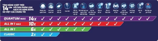 Với 10 chức năng tiên tiến, sự kết hợp của công thức tẩy rửa tiên tiến với các thành phần độc đáo cùng với nhiều tính năng ưu việt khiến sản phẩm có sức mạnh vượt trội giúp tẩy sạch chất dầu mỡ và thức ăn thừa bám trên bát đĩa. Khả năng diệt khuẩn và làm bóng bát đĩa với công nghệ Nano Protector